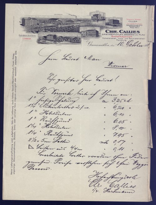 Briefkopf des Dampfsägewerks Chr. Callies in Grevesmühlen, Dassow und Plau