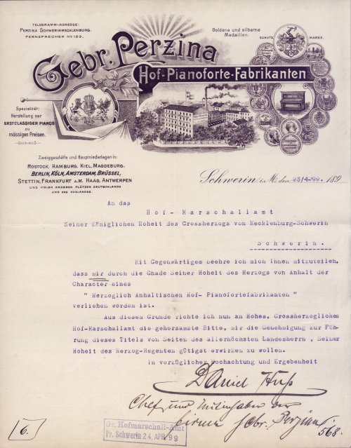 In den 1880er Jahren steigen die Gebrüder Perzina zum Hof-Pianofabrikanten des Großherzogtums Mecklenburg, "Ihrer Majestät der Königin der Niederlande", "Seiner Majestät des Königs von Portugal" und "Seiner Hoheit des Herzogs von Anhalt" auf.