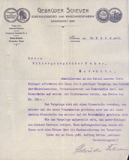 Der Briefkopf ist auf einem Angebotsschreiben abgebildet und stammt aus dem Jahr 1911. Links und rechts befinden sich je zwei Drucke, die unter anderem den "Staatspreis für hervorragende Leistungen" und das Profil des Großherzogs Mecklenburg-Schwerin zeigen. Zwischen den Drucken steht in großer lateinischer Druckschrift der Firmenname: Gebrüder Scheven, Eisengießerei und Maschinenfabrik, gegründet 1866.