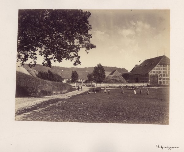 Das einstöckige Haus und der eher zweckmäßig angelegte Vorhof machen deutlich, dass es sich hier um einen nicht ganz so wohlhabenden Gutshofbesitzer handeln muss; im Gegensatz zum Haus auf dem ersten Foto. Dennoch ist auch hier der Großteil der Dächer mit Ziegeln gedeckt und nicht mehr mit Reet, welches im 19. Jh. noch das Dachdeckermaterial der armen Bevölkerung war. Ein Sandweg führt an Feldern und Wiesen vorbei zum Gutshaus. Gleich hinter der niedrigen Steinmauer beginnen die landwirtschaftlichen Flächen. Auf der Wiese und auf dem Weg haben sich das Personal und/oder Tagelöhner/Bauern für das Foto aufgestellt. Im Hintergrund liegen auf der Wiese landwirtschaftliche Geräte.